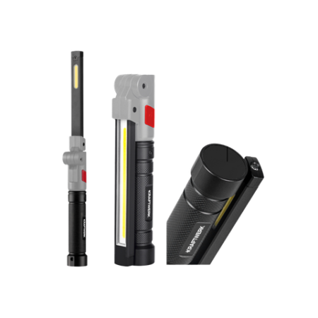 Lanterna LED multifunções, ideal para uso profissional e doméstico. Equipada com luz frontal COB-LED de dupla fonte (350 lúmens) e LED superior potente (120 lúmens), garante uma iluminação eficaz em diferentes situações.